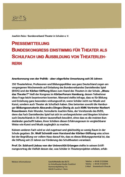 Am Ende verabschiedete der BVTS eine „Hamburger Resolution zum Theaterunterricht in der Sekundarstufe I“.