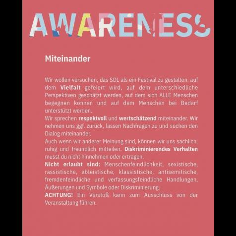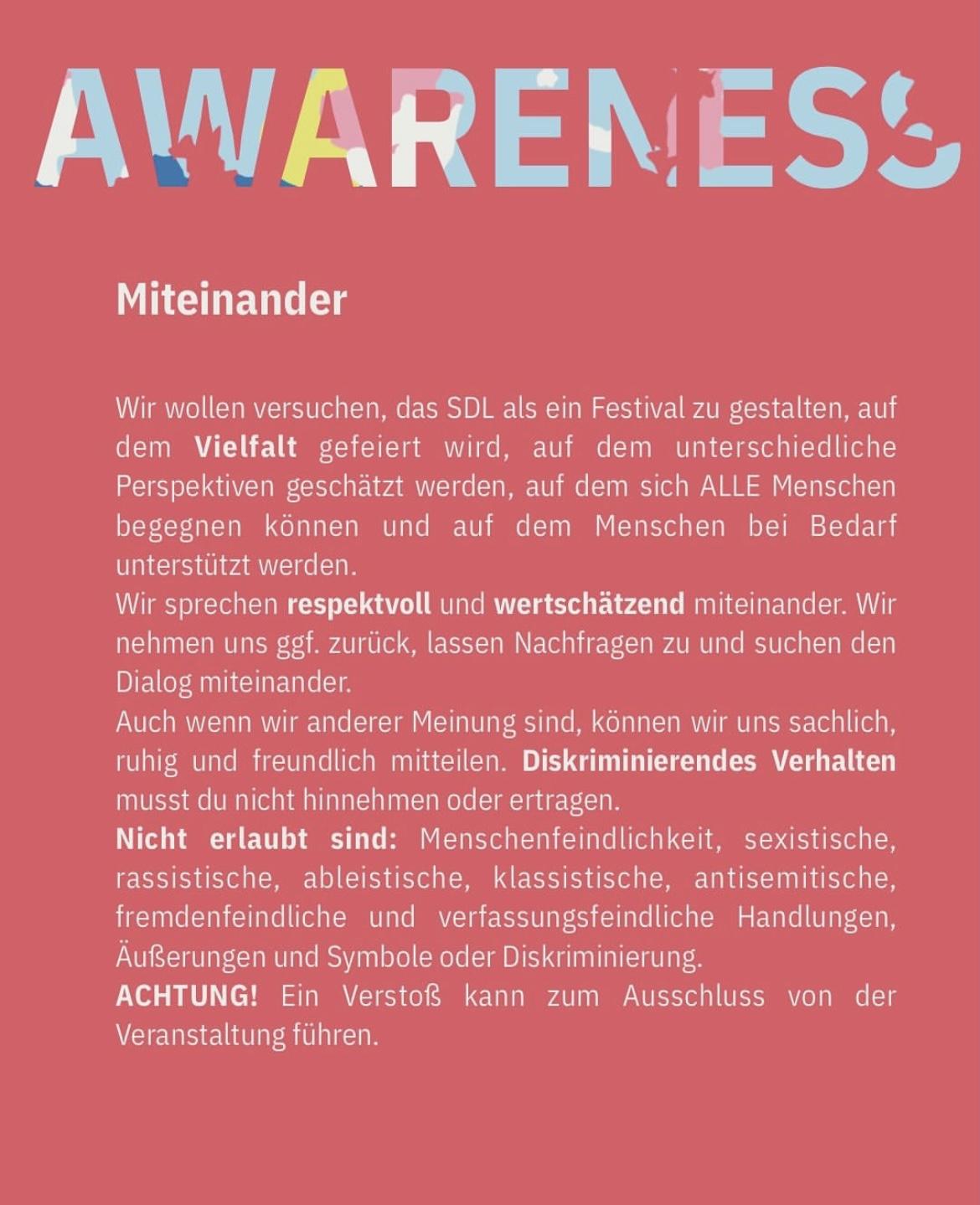 Wir wollen versuchen, das SDL als ein Festival zu gestalten, auf dem Vielfalt gefeiert wird, auf dem unterschiedliche Perspektiven geschätzt werden, auf dem sich ALLE Menschen begegnen können und auf dem Menschen bei Bedarf unterstützt werden.