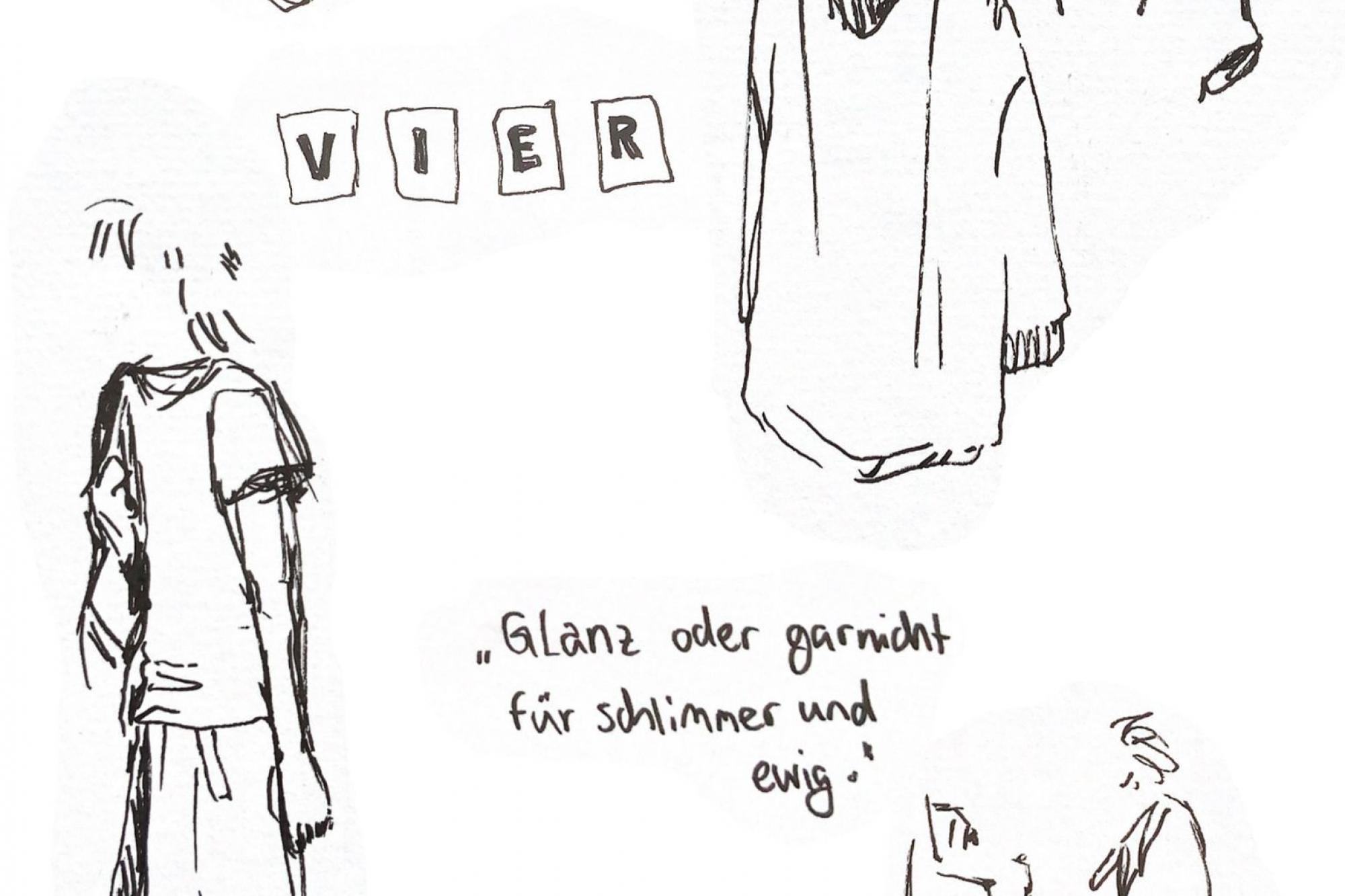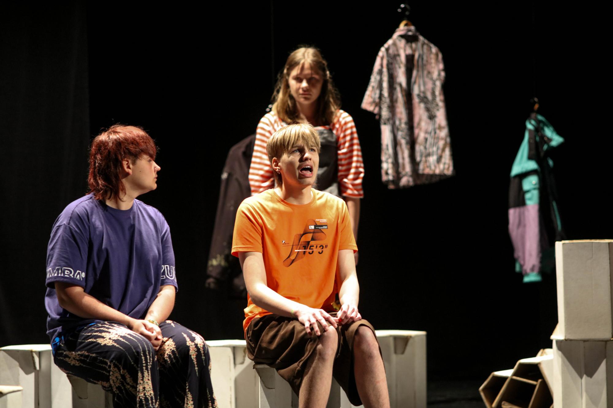 Alles beginnt mit Malte, der aus dem Publikumsraum heraus die Bühne betritt. Er spricht ins Publikum: “Ich weiß gar nicht mehr, wie sich meine Mutter von mir verabschiedet hat.” Sofort wird das Bühnenbild aufgebaut. Es besteht aus mehreren Hockern aus Karton, die ein flexibles Bühnenbild ermöglichen und drei Kleiderbügeln, die von der Decke fahren und jeweils eine Jacke tragen, die flexibel von verschiedenen Schauspieler:innen zur Darstellung der anderen drei Hauptcharaktere genutzt wird. Somit haben die Rollen auch optisch kein lesbares Geschlecht.
